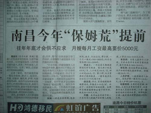 記者了解到,現(xiàn)在家政市場一般包含保姆、鐘點工、保潔員、月嫂、育嬰師、催乳師、護理、電器清洗等8種。南昌市金保姆家政服務(wù)中心的黃經(jīng)理告訴記者,隨著生活水平的提高,家政市場需求量很大。但目前南昌市家政服務(wù)市場人員供應(yīng)偏緊,原因是多方面的。